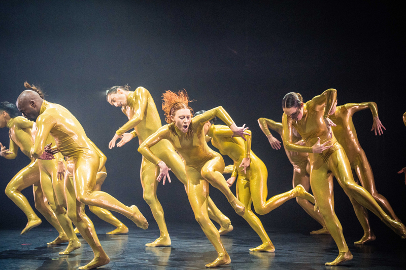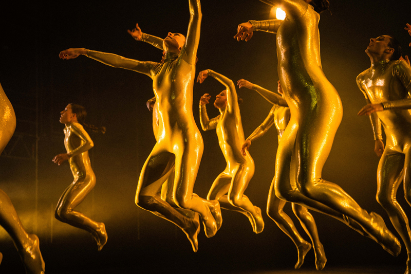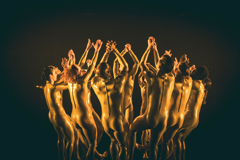 Gekleidet sind die TänzerInnen in goldene, eng anliegende Bodysuits, die je nach Situation und Lichteinfall unterschiedliche Wirkungen entfalten. Es entstehen Assoziationen von nackten, mit Erde oder Ton beschmierten archaischen Menschen, ebenso wie die Vorstellung, auf eine futuristische Gesellschaft zu blicken, wobei der leere Bühnenraum (manchmal ist weniger mehr) Eindrücke einer imaginären Welt, eine von vielen denkbaren Welten, heraufbeschwört.